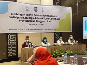 Koordinator Pembangunan Kependudukan, Pemuda, Olahraga dan Pemberdayaan Perempuan Bappeda Provinsi NTB, Imelda Katharina Asbanu, SP, MPP, M.Eng., menjadi narasumber pada Acara Bimbingan Teknis Pelaksanaan Kebijakan Pertisipasi Keluarga dalam KG, PHP dan PA di Provinsi NTB yang diadakan oleh Kementerian Pemberdayaan Perempuan dan Perlindungan Anak RI. Dihadiri perangkat daerah terkait lingkup Pemerintah Provinsi NTB. Bertempat di Hotel Santika Mataram, Rabu 8 Juni 2022.