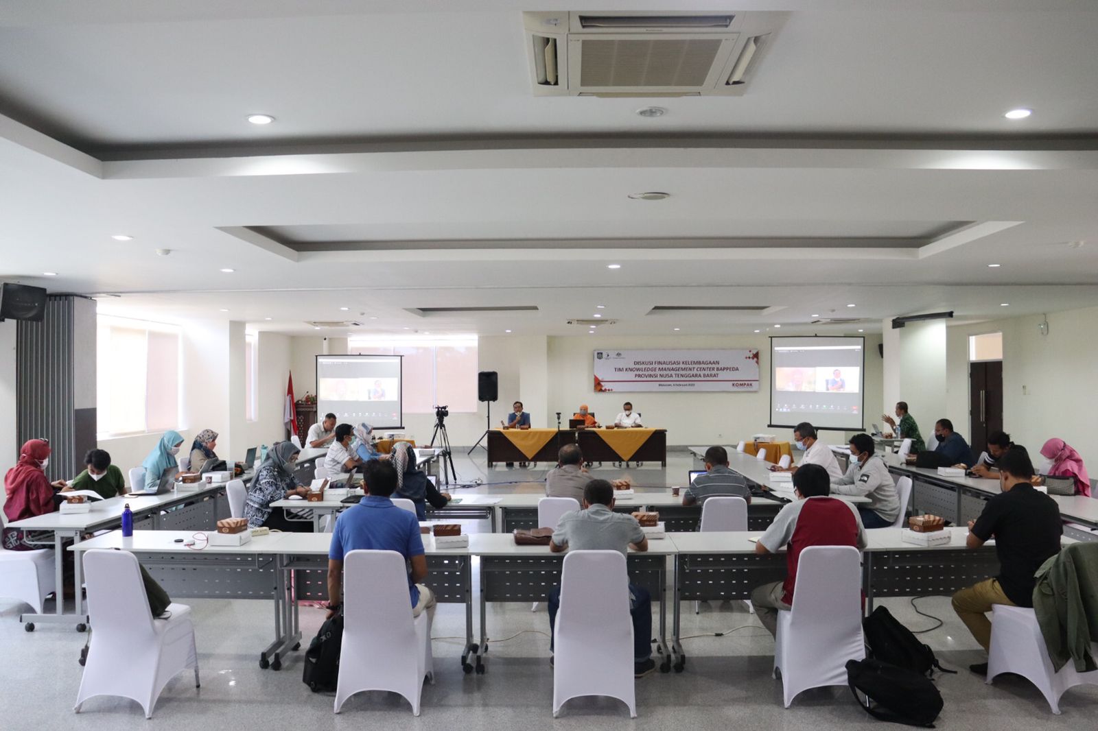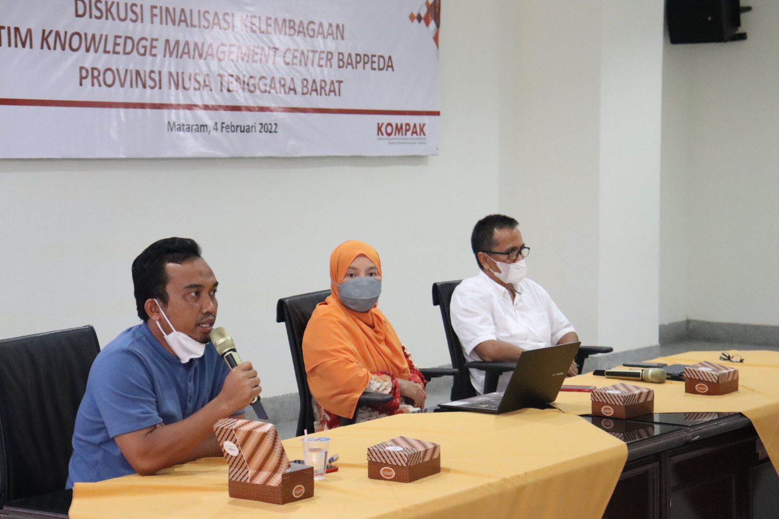 Manajer Provinsi KOMPAK NTB, Lalu Anja Kusuma membuka Diskusi Finalisasi Kelembagaan Tim Knowledge Management Center (KMC) Bappeda Provinsi NTB. Digelar di Ruang Rapat Wisma Tambora BPSDM NTB, diskusi dihadiri Kepala Bidang, Fungsional dan staf pelaksana Bappeda NTB. 4 Februari 2022.