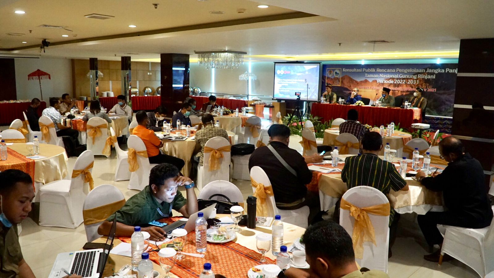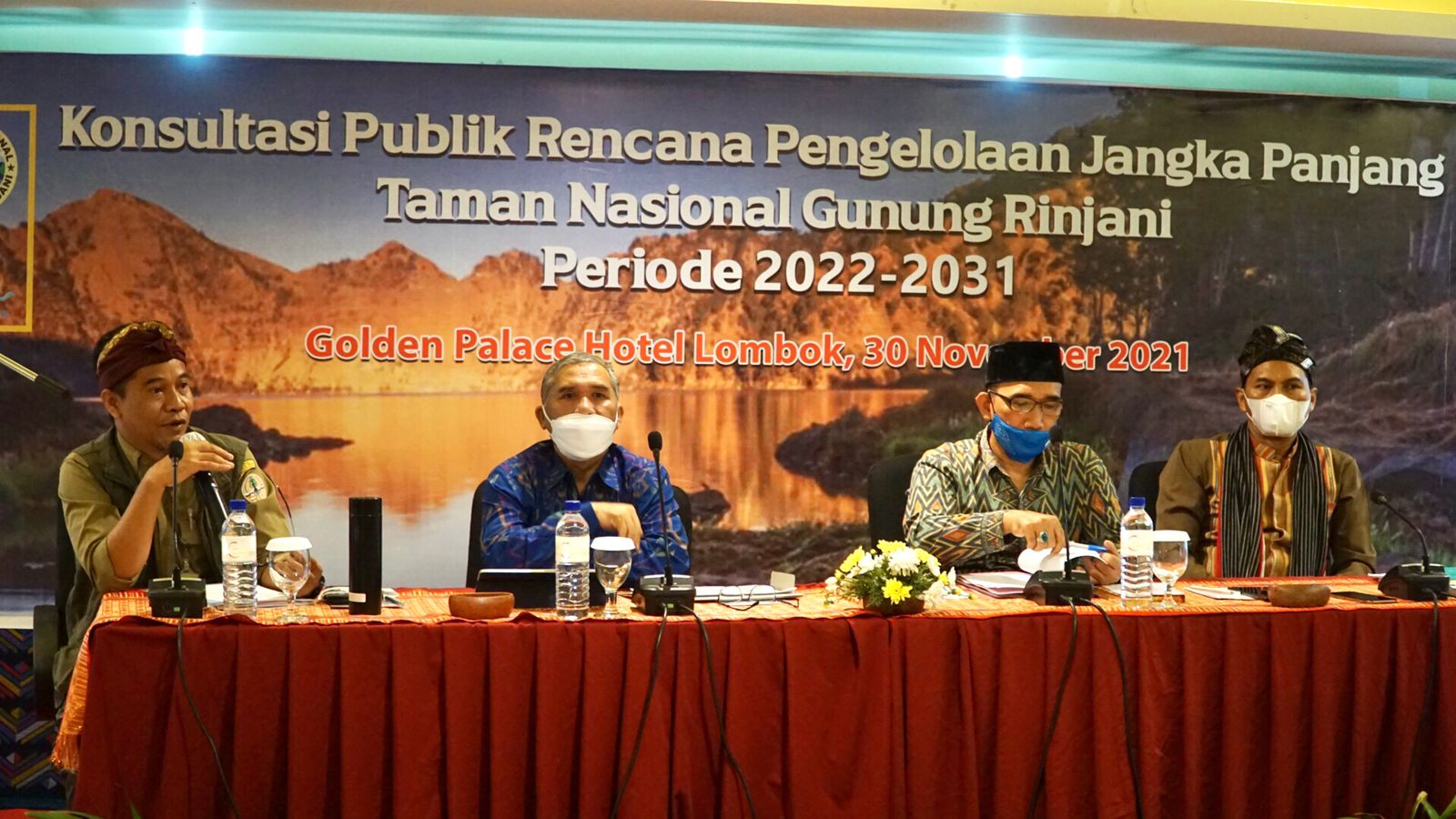 Kepala Bappeda Provinsi NTB, Dr. Ir. H. Iswandi, M.Si., menjadi narasumber dalam konsultasi publik rencana pengelolaan jangka panjang taman nasional gunung rinjani periode 2022-2031 dihadiri Kepala Taman Nasional Gunung Rinjani, General Manager Geopark Rinjani, perwakilan Dinas Pariwisata, Dinas Lingkungan Hidup dan Kehutanan Provinsi dan Kabupaten/Kota se-Provinsi NTB bertempat di Golden Palace Hotel, Selasa, 30 November 2021.