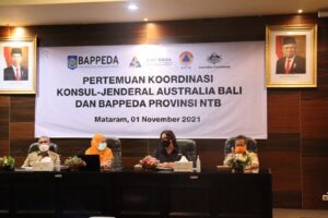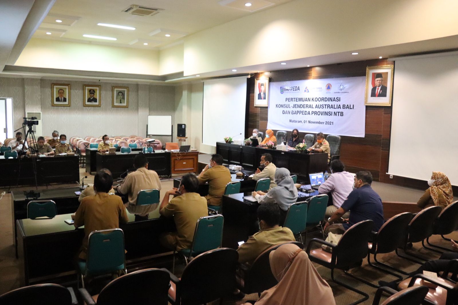 Didampingi Pejabat Fungsional Perencana Madya Bappeda Provinsi NTB, Hj. Suryani Eka Wijaya, ST., MBA.,P.hD, Kepala Bappeda Provinsi Bappeda Provinsi NTB, Dr. Ir. H. Iswandi,M.Si memimpin pertemuan dengan Konsulat Jendral Australia berkaitan dengan Program Siap Siaga di Provinsi Nusa Tenggara Barat dihadiri Kepala Pelaksana BPBD Provinsi NTB, dan seluruh Kepala Bidang, Kasubbid dan Pejabat Fungsional, bertempat di ruang rapat Geopark, Senin 1 November 2021.