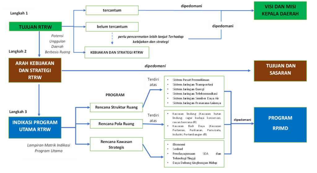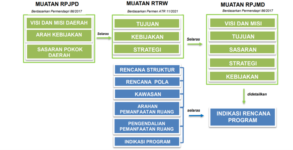 - Permendagri Nomor 86 Tahun 2017, Pasal 160 bahwa penelaahan dokumen perencanaan pembangunan dalam penyusunan RPJPD dan RPJMD mengandung makna mempedomani RTRW, melalui penyelarasan antara sasaran, arah kebijakan, dan sasaran pokok pembangunan jangka panjang maupun jangka menengah daerah dalam RPJPD dan RPJMD dengan tujuan, kebijakan, serta rencana struktur dan rencana pola ruang wilayah dalam RTRW. Dasar pemikirannya adalah RPJMD menjadi bagian dari penyelenggaraan RTRW agar kesesuaian pola ruang dan struktur ruang di setiap wilayah dapat diwujudkan melalui program-program pembangunan daerah.
