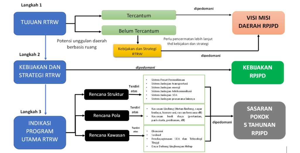 - Merumuskan arah kebijakan dalam RPJPD dengan mempedomani arah kebijakan dan strategi pada RTRW melalui pencermatan isi substansi dalam Rencana Tata Ruang Wilayah;