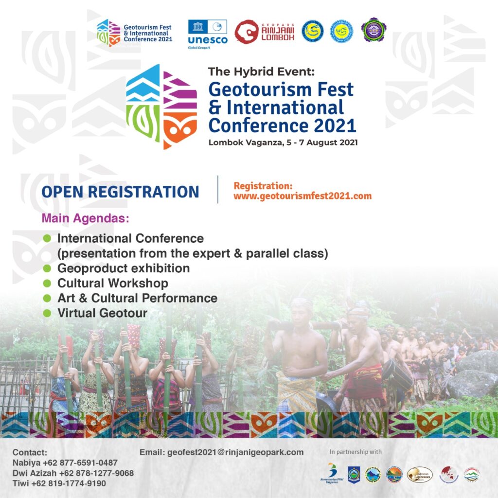 Acara Geotourism Festival & International Conference 2021 ini diprakarsai oleh Badan Pengelola Dewan Pelaksana Rinjani Lombok UNESCO Global Geopark bekerjasama dengan Sekolah Tinggi Pariwisata (STP) Mataram dan Ikatan Ahli Geologi (IAGI) Pengda NTB didukung oleh Kementrian Pariwisata & Ekonomi Kreatif melalui Deputi Produk Wisata dan Penyelenggaraan Kegiatan (Events), Direktorat MICE, Bappenas RI, Pemerintah Provinsi NTB, Jaringan Geopark Indonesia (JGI), Japan Geopark Network (JGN) dan Asia Pacific Geopark Network (APGN).