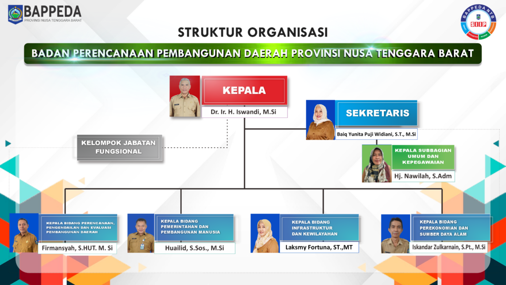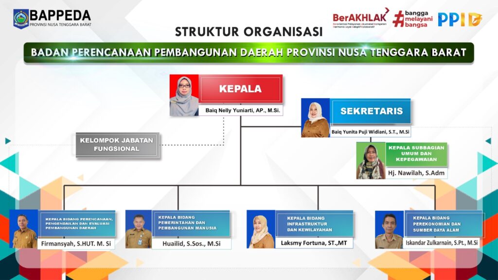 Berdasarkan Lampiran Peraturan Gubernur Nusa Tenggara Barat Nomor 9 Tahun 2023 tentang KEDUDUKAN, SUSUNAN ORGANISASI, TUGAS DAN FUNGSI SERTA TATA KERJA BADAN DAERAH PROVINSI NUSA TENGGARA BARAT maka Struktur Organisasi Bappeda sebagai berikut: