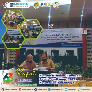 Sehubungan dengan kegiatan tersebut Perwakilan Bidang Infrastruktur dan Kewilayahan Bappeda Provinsi NTB, mengikuti Rapat Konsultasi Publik II Rencana Detail Tata Ruang Kecamatan Sandubaya dalam rangka tindak lanjut dari konsultasi I Rencana Detail Tata Ruang (RTDR). Bertempat di Hotel Aston Inn, selasa, 30 November 2021.