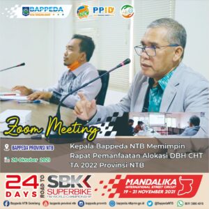 Didampingi Kepala Bidang Perencanaan, Pengendalian dan Evaluasi Pembangunan Daerah , Kepala Bappeda Provinsi NTB, Dr. Ir. H. Iswandi, M.Si., memimpin rapat pemanfaatan Dana Bagi Hasil Cukai Hasil Tembakau Tahun Anggaran 2022 Provinsi NTB diikuti perwakilan seluruh OPD lingkup Pemerintah Provinsi NTB , bertempat di ruang rapat Lakey, Selasa 26 Oktober 2021.