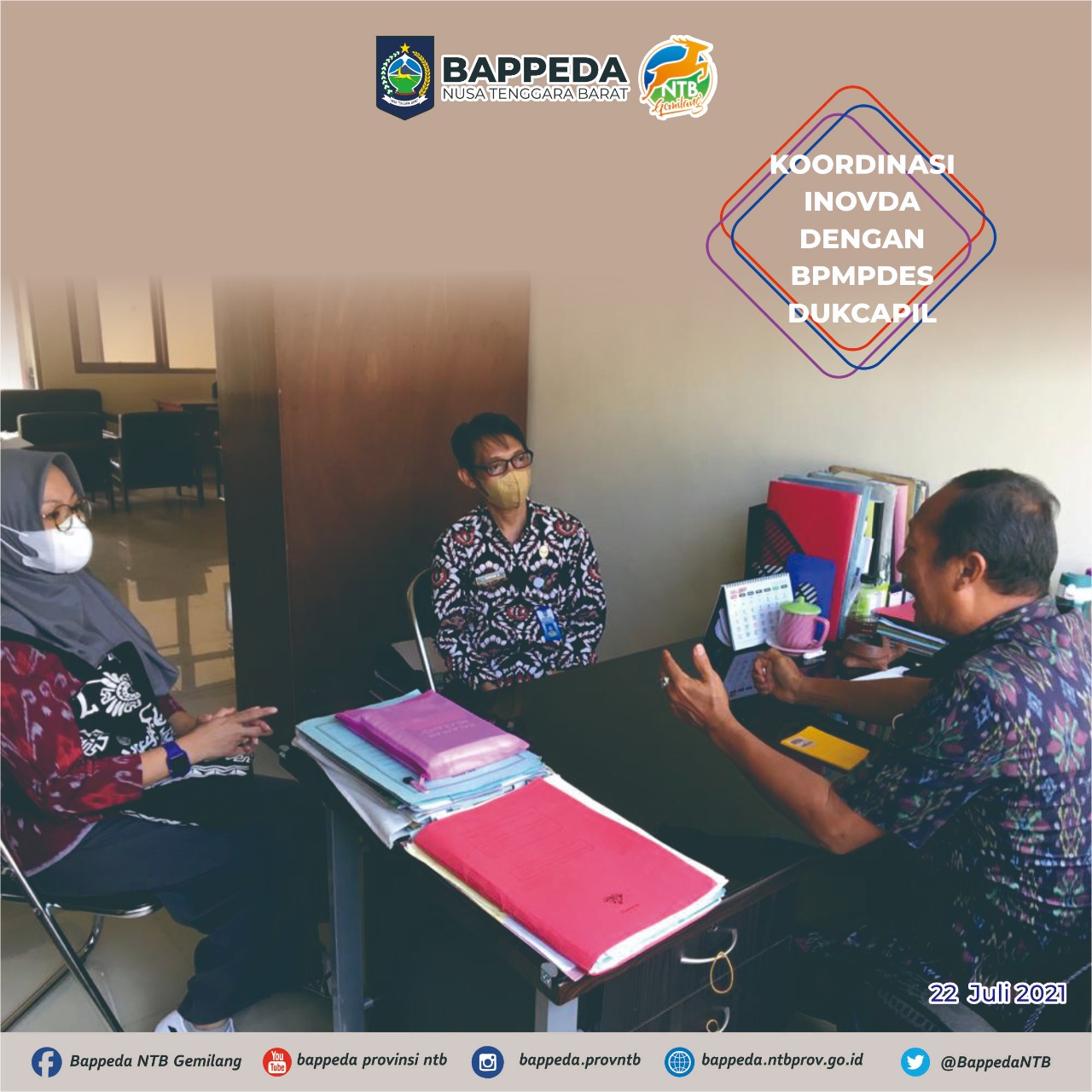 Kamis, 22 Juli 2021, Bidang Penelitian dan Pengembangan Bappeda Provinsi NTB melakukan kegiatan Sosialisasi dan Koordinasi Entri Data Inovasi Daerah Provinsi NTB di Dinas Peternakan Provinsi NTB, Dinas Pariwisata Provinsi NTB, dan BPMPD Dukcapil Provinsi NTB.