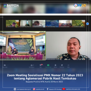 Syamsul Hidayat, S.Pt dan Ir. Asdiah Triana Sekretariat DBH CHT Bappeda NTB mengikuti Sosialisasi PMK No.22 Tahun 2023 tentang Aglomerasi Pabrik Hasil Tembakau (APHT). Diinisiasi oleh Kementerian Keuangan RI Direktorat Jenderal Bea dan Cukai Direktorat Teknis dan Fasilitas Cukai, kegiatan ini dilaksanakan secara hybrid. 30 Maret 2023.